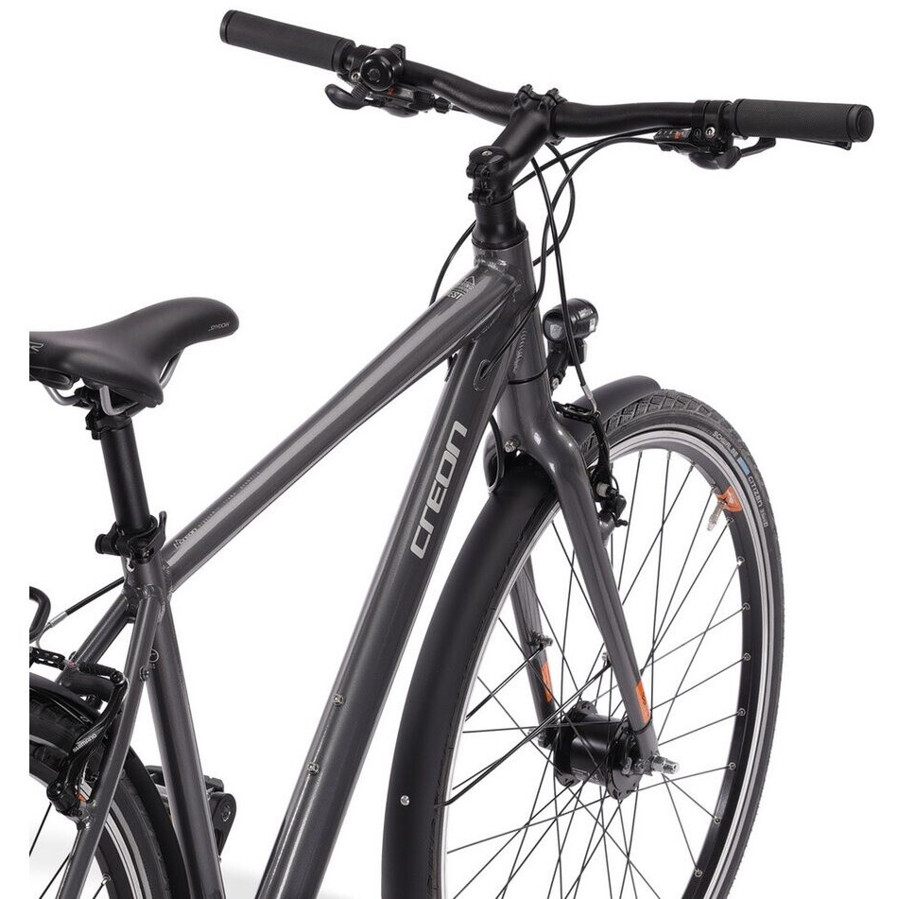 Der klassische Diamantrahmen in stilvollem Grau bietet optimale Stabilität und ein sportliches Fahrgefühl. Die 28-Zoll-Bereifung sorgt für hervorragende Laufruhe und Effizienz auf langen Strecken.