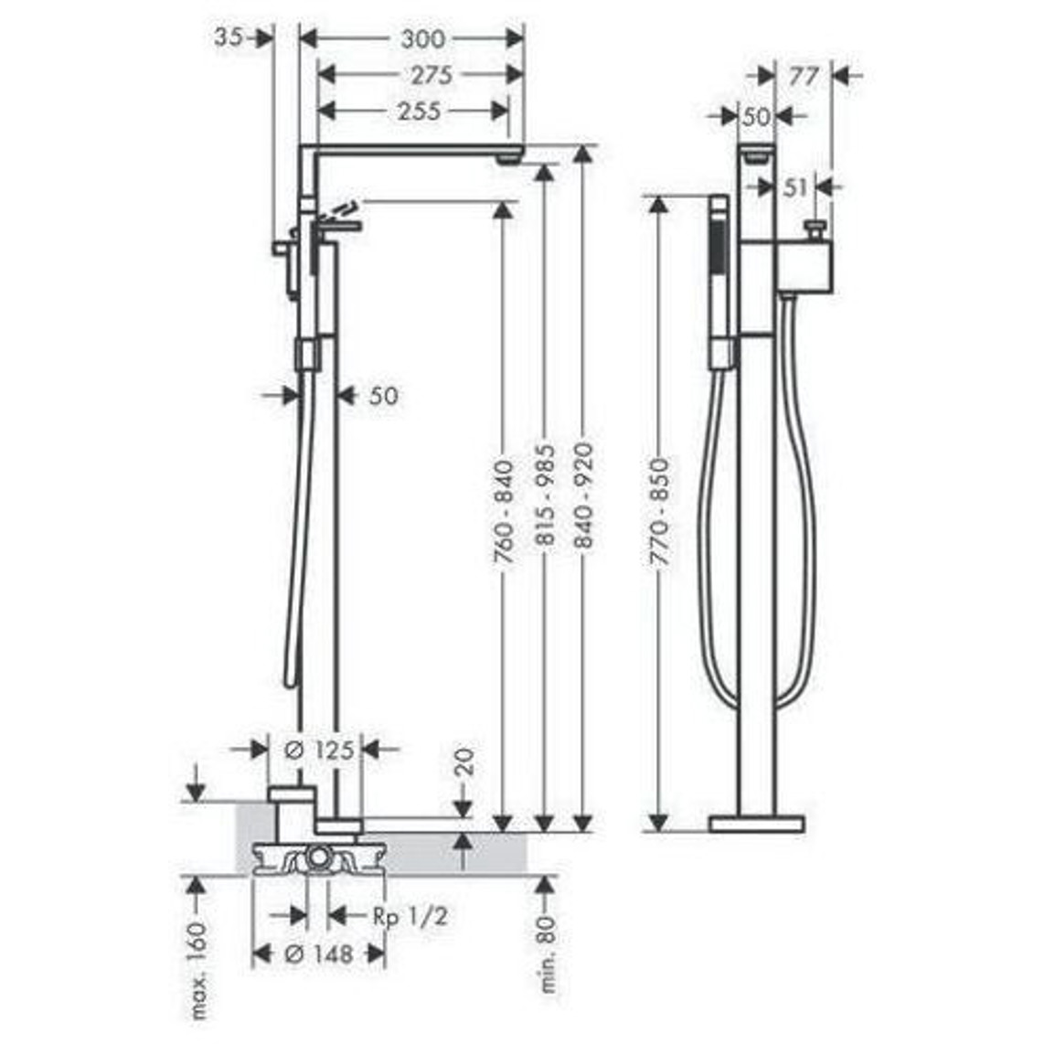 Die Bedienung erfolgt mühelos über den praktischen Bedienungshebel, während die Montage dank der Bodenmontage einfach und schnell von der Hand geht. Mit einer großzügigen Ausladung von 255 mm und einer Höhe von 840 mm passt der Wannenmischer perfekt in jedes Bad.