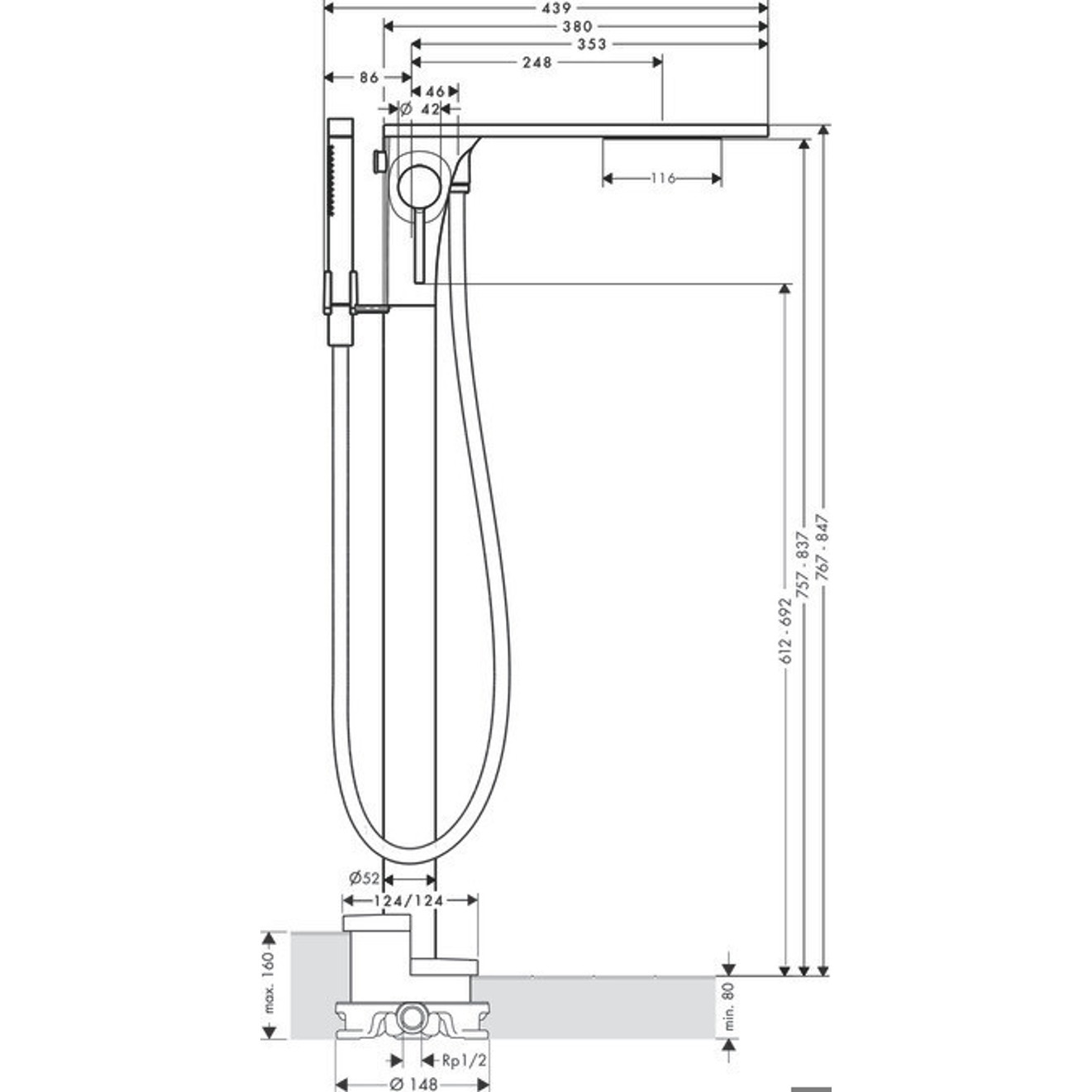 | Bemerkung: | breiter Schwallstrahl / für Montage auf dem Badezimmerboden / Durchflussmenge ca. 22 l/min / mit Axor Starck Handbrause mit Normal- und Softstrahl / Brausenschlauch 1,25 m |