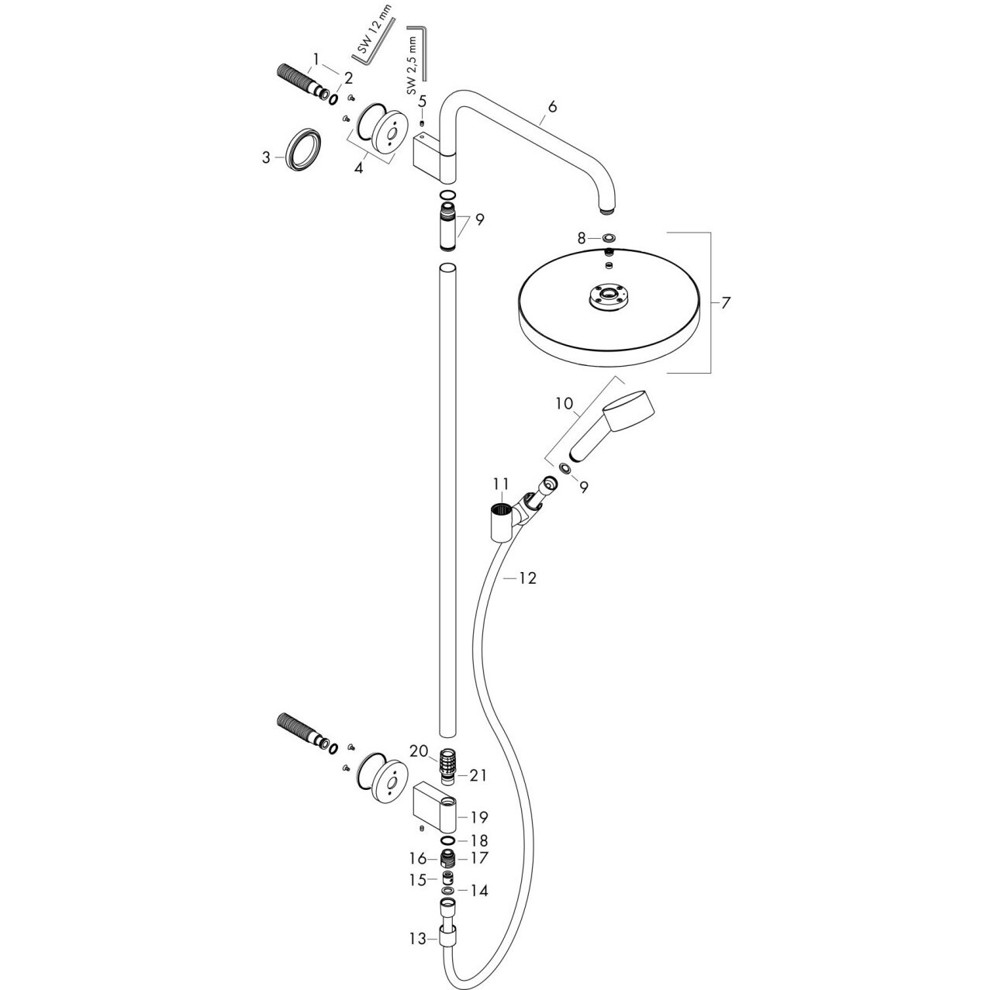 | Komponenten Duschsystem: | Brausehalter, Kopfbrause, Brausearm, Brauseschlauch, Thermostatbatterie, Handbrause, Duschstange |