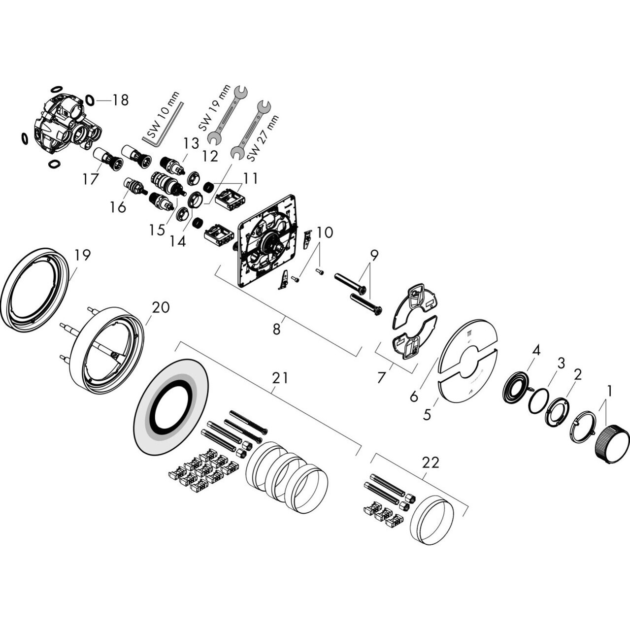 | Bedienelemente: | Hansgrohe Select Verbraucherumstellung, Hansgrohe SafetyStop Temperaturbegrenzung |