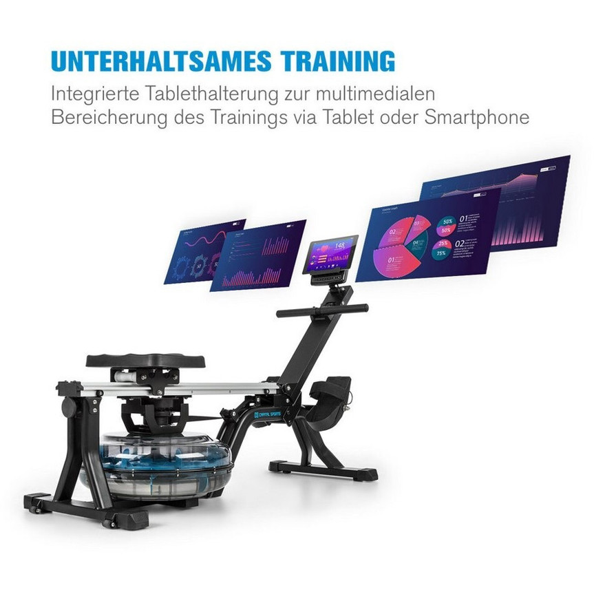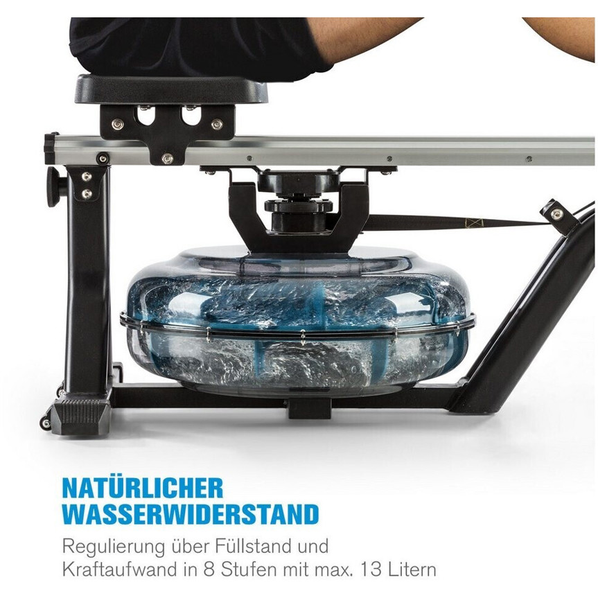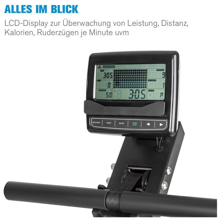 Mit einem maximalen Körpergewicht von bis zu 150 kg bietet das Rudergerät Stabilität und Zuverlässigkeit bei jedem Workout. Das innovative Bremssystem mit Wasserwiderstand sorgt für ein realistisches Rudergefühl, während das LCD-Display wichtige Informationen wie Schlagfrequenz und Distanz übersichtlich anzeigt.