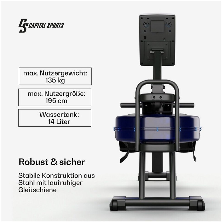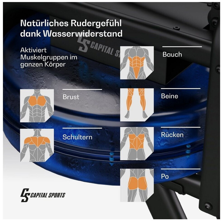 Entdecken Sie das Capital Sports Indoor Rower in elegantem schwarz, das perfekte Rudergerät für Ihr Zuhause. Mit seinem fortschrittlichen Wasserwiderstand Bremssystem erleben Sie ein realistisches und angenehmes Rudergefühl, das sich ideal für Ihr Training eignet.