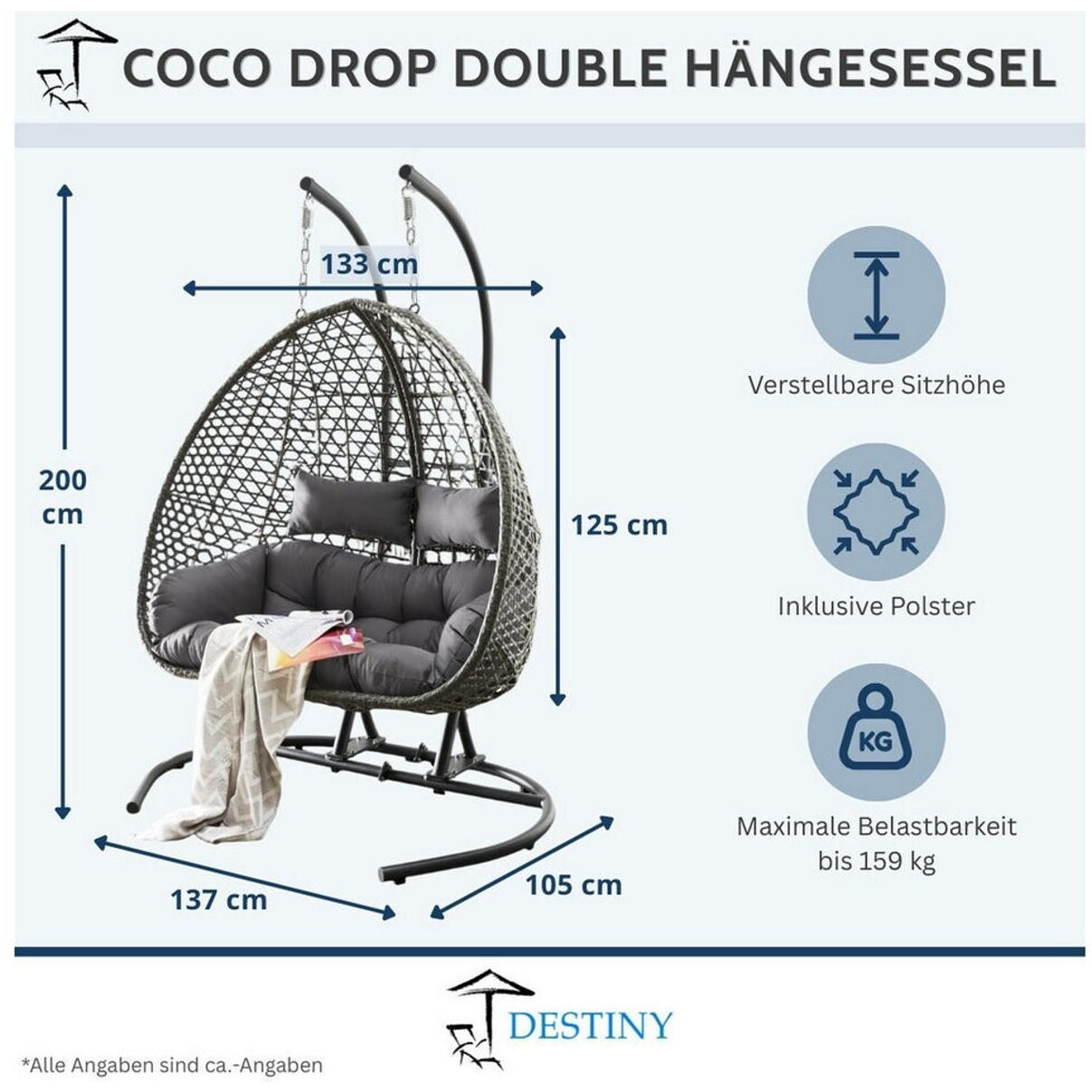 Ob als gemütlicher Rückzugsort zum Lesen, als stylisches Gartenmöbel für laue Sommerabende oder als trendiger Hingucker auf der Terrasse – der Destiny Coco Drop überzeugt in jeder Situation. Das moderne Grey-Design passt perfekt zu zeitgenössischen Einrichtungsstilen.