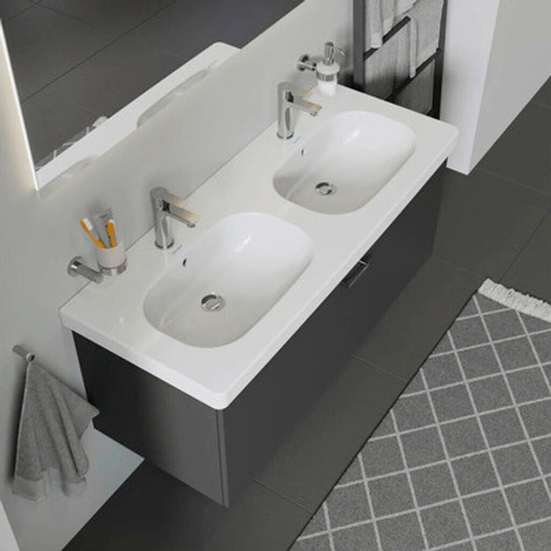 Entdecken Sie die herausragende Duravit DoppelD-Code Waschbeckenlösung in elegantem weiß. Dieses stilvolle Waschbecken, entworfen von Sieger Design, kombiniert modernes Design mit funktionaler Ästhetik. Mit einer großzügigen Breite von 120 cm und einer Tiefe von 48 cm bietet es ausreichend Platz für zwei Nutzer.