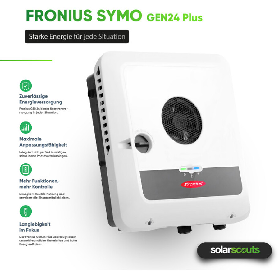 Der Fronius Symo GEN24 8.0 Plus ist die intelligente Lösung für Ihre Photovoltaikanlage. Als Hybrid-Wechselrichter kombiniert er die Vorteile modernster Solartechnologie mit der Möglichkeit zur Batteriespeicherintegration und macht Sie unabhängiger von steigenden Strompreisen.