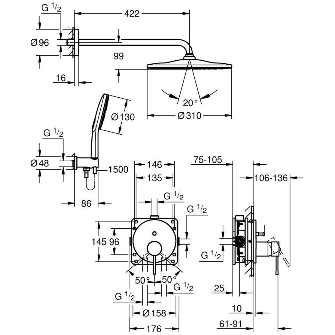 | Komponenten Duschsystem: | Grundkörper, Kopfbrause, Einhandmischer, Brausearm, Brauseschlauch, Thermostatbatterie, Handbrause, Wandanschlussbogen |