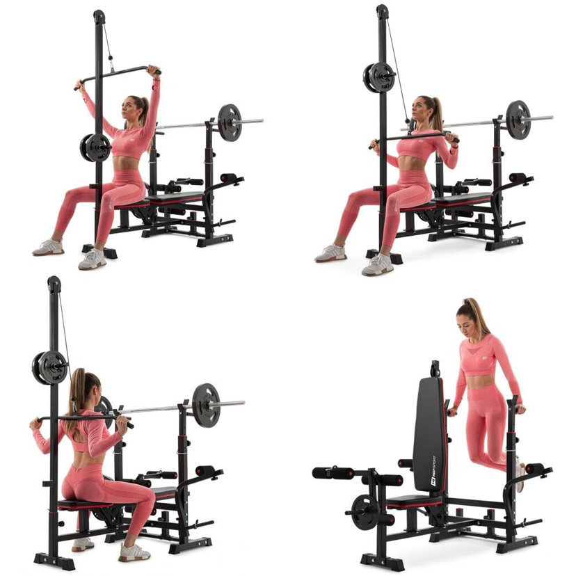 Um noch gezielter trainieren zu können, bietet die Hantelbank verschiedene Übungsstationen, darunter einen Beincurler und ein Curlpult, die ideal für das Training der Muskelgruppen Trizeps und Brust sind. Die elegante Kombination aus schwarzem Rahmen und schwarzer sowie roter Polsterfarbe verleiht Ihrem Fitnessraum nicht nur eine stilvolle Note, sondern macht das Training auch angenehm.