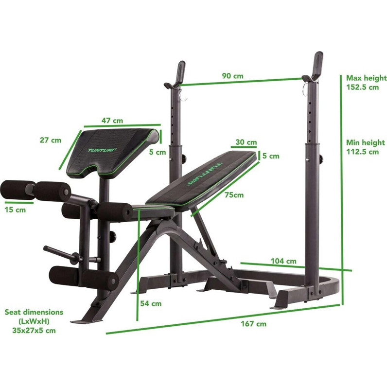 Mit einer Länge von 167 cm und einer Breite von 104 cm bietet die Hantelbank genügend Platz, um verschiedene Übungen durchzuführen. Sie können damit Ihre Arme, Beine, Brust und Schultern effektiv trainieren. Die Rückenlehne ist 6-fach verstellbar und die Langhantelablage ebenfalls 6-fach verstellbar, sodass Sie die Bank an Ihre individuellen Bedürfnisse anpassen können.
